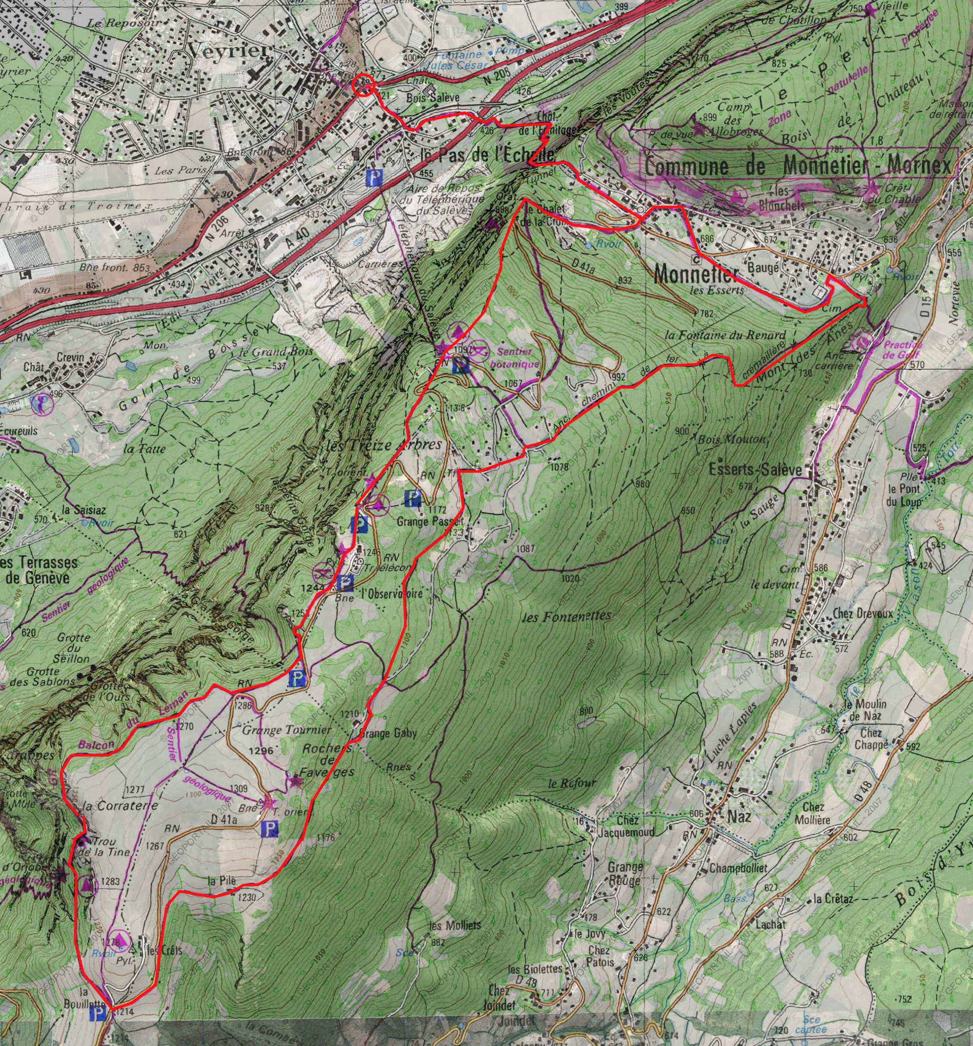 (see plan). After the bridge turn right on the road leading to Archamps for 50 meters (to your left a retaining wall of 140 cm high) then turning to the left (between the wall and the electric pylon) 90° climb the slope and enter the forest. 200 meters further you reach the quarry. Turn right and instead of going left after 50 meters as for the Grande Gorge, leave the signs and continue straight ahead. After 160 meters you will reach an intersection (marked by a large stone and a double line orange on a tree). Instead of continuing straight turn left at 90°. After 100 meters you arrive at a Canadian Crossing, entrance of the Bossey golf. Behind this pass is the communal road that runs through the golf (the golf is private but the passage is public). After 1.3 km, and some laces, the main track ends at the castle of Crevin which hosts the association of the golf (the castle of Crevin overlooks the green of hole number 3 and hole number 4). After the castle descend the road of Crevin then the road of the Cross. The asphalt road ends at the church and turn left to follow the street of the Town hall to arrive at the Town hall. Then follow the road of Pierre-Grand, just before the waste disposal center, on the right, you cross a pedestrian bridge that spans the A40 motorway. Then cross the railway line (Warning : if the warning light is blinking - wait for the train to pass). Cross the D1206 (caution!). You arrive at the Swiss border post of Pierre-Grand. 20m afterwards, turn to the left, take the road of Evordes, pass the equestrian center of Evordes. Take the chemin des Forcles to Croix-de-Rozon. Turn left onto Rue du Pont-de-la-Fin until the customs and bus stop 44. The hike takes 2 hours walking on the flat.