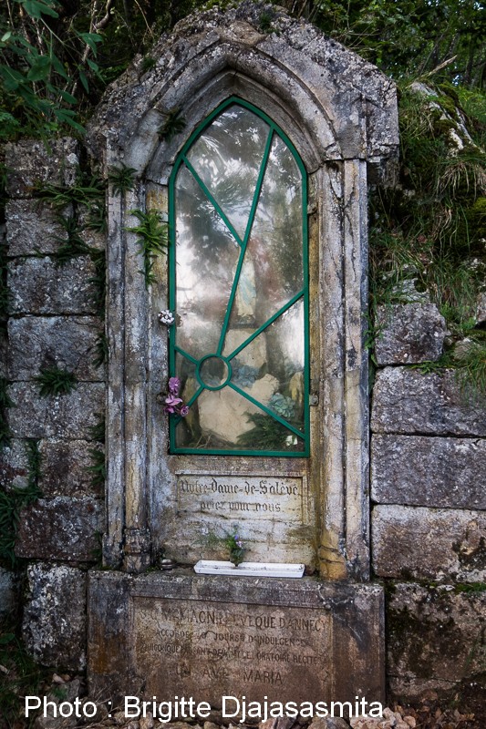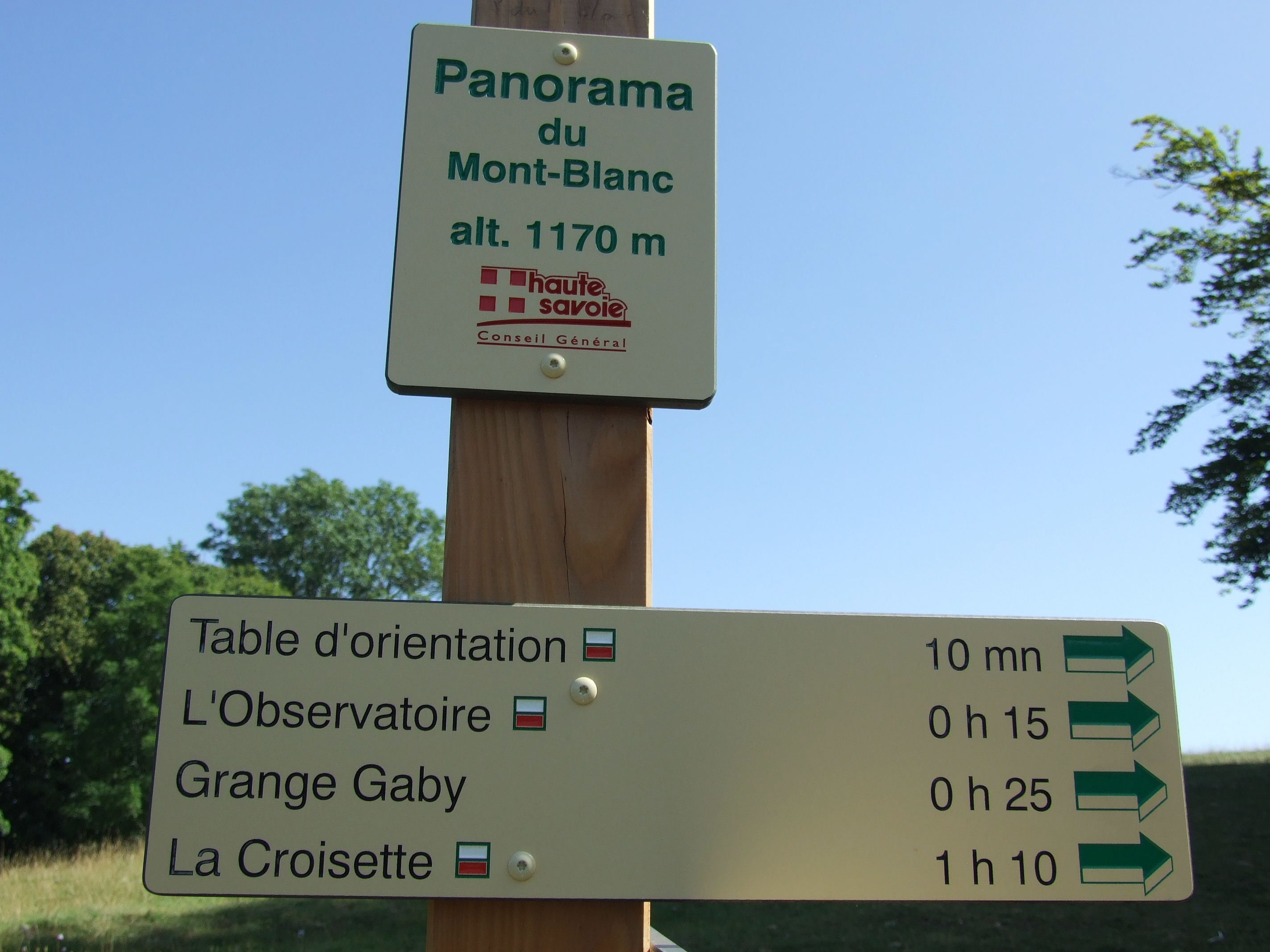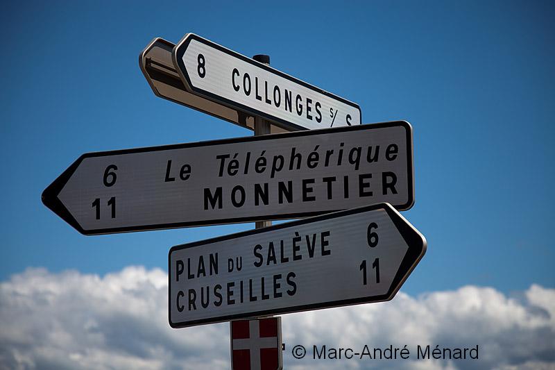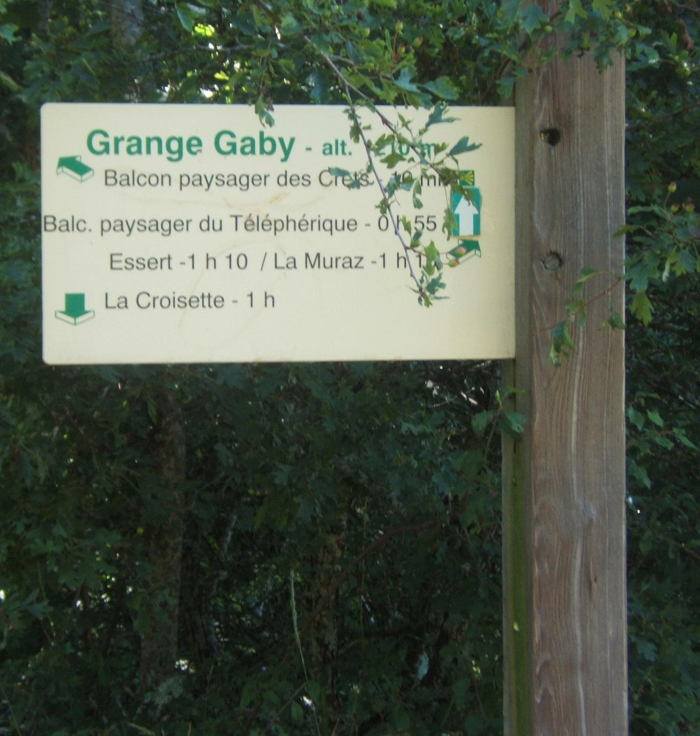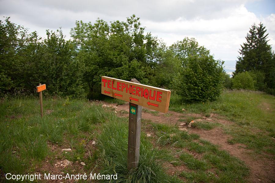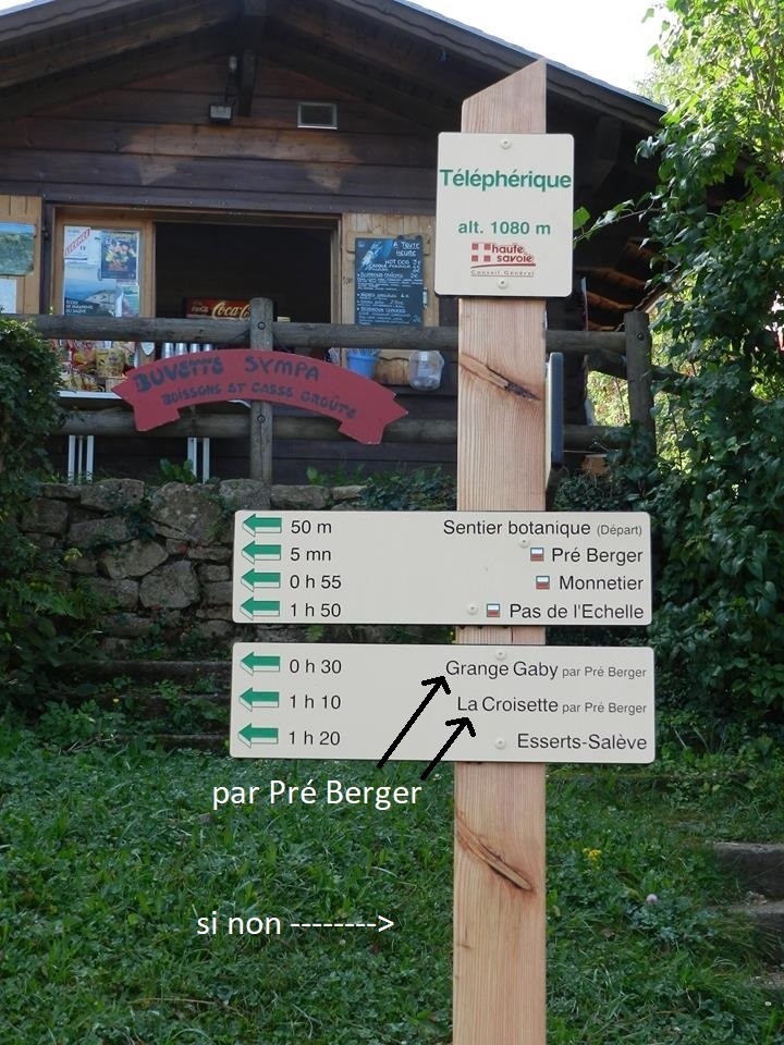 Ab der Bushaltestelle ist der Wanderweg Richtung "Le Pas de l'Echelle" folgen. Weiter Richtung Téléphérique, die Bahngleise überschreiten und dann nach links. Ueber die Autobahn via Brücke 10 Meter nach links, dann nach rechts, und man kommt in den Wald. Nun auf den Wanderweg (mit gelben Pfeilen auf grünem Grund (neu) und rot-weissen Farbmarkierungen (alt) markiert) und recht steil hinauf. Stellenweise Treppen und etwas ausgesetzt, aber meistens mit Geländer gesichert. In Monnetier bis zur Kirche, dann wieder rechts hinauf zu "Le Chalet de la Croix". Ich bin auf dem Weg der etwas südlich ausholt bis zu der Seilbahn auf 1097m.