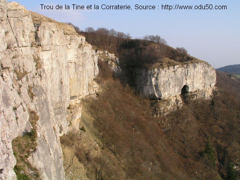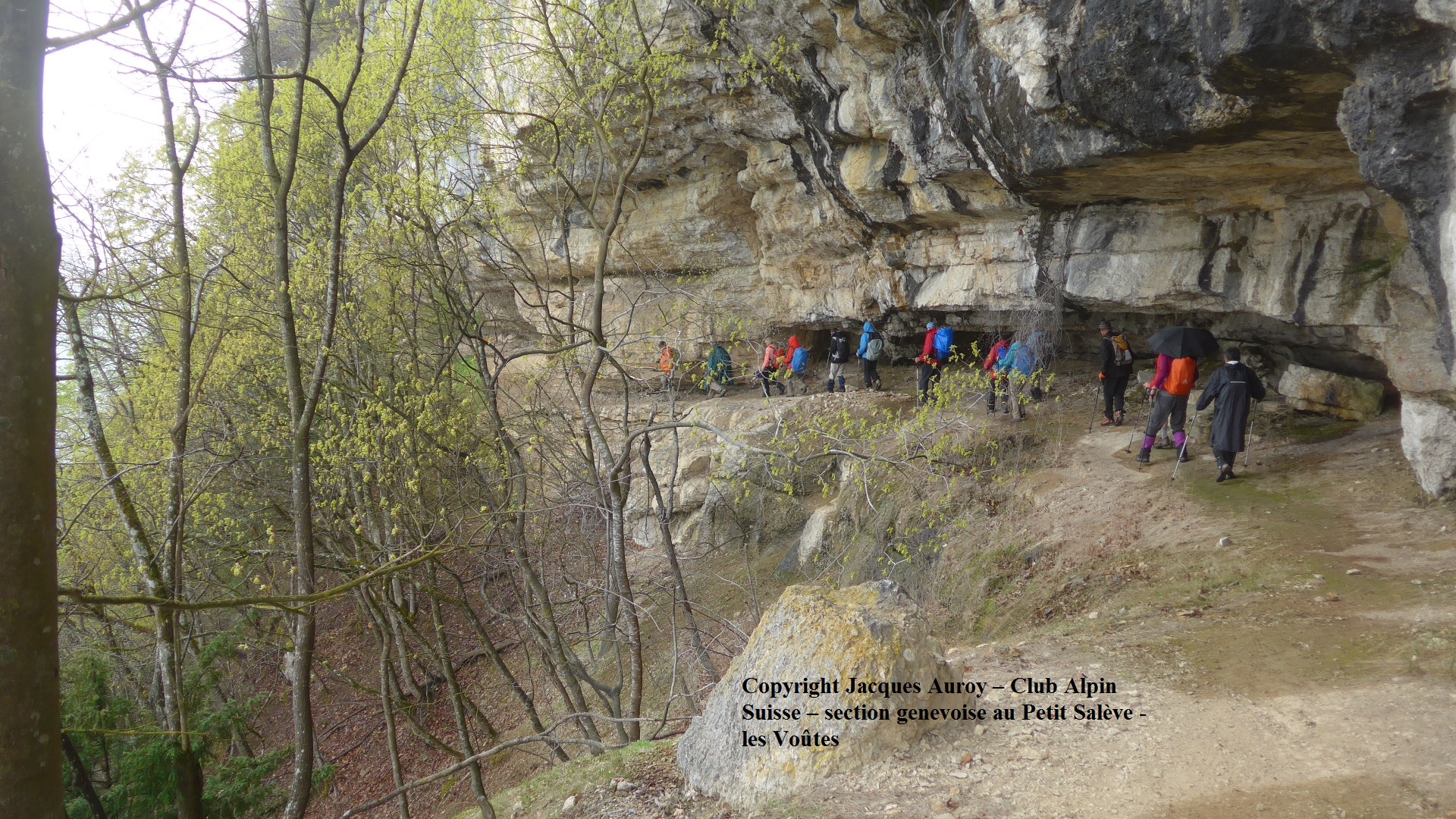 Auf dem Gipfelplateau war dann tatsächlich viel Betrieb, und ich ging gleich weiter Richtung 'Corraterie'. Nach einem ersten, etwas feuchten Teil durch den Wald führt der Weg unter dem obersten, teilweise überhängenden Felsband durch. Von hier aus hat man wieder eine herrliche Aussicht auf Genf. Etwas weiter kommt man zum 'Trou de la Tine', einem Felsenloch. Man hat die Wahl, das Loch von unten oder oben anzusehen. Ich habe mich diesmal für den oberen Weg entschieden, der über die Felsbrücke über dem Loch führt.