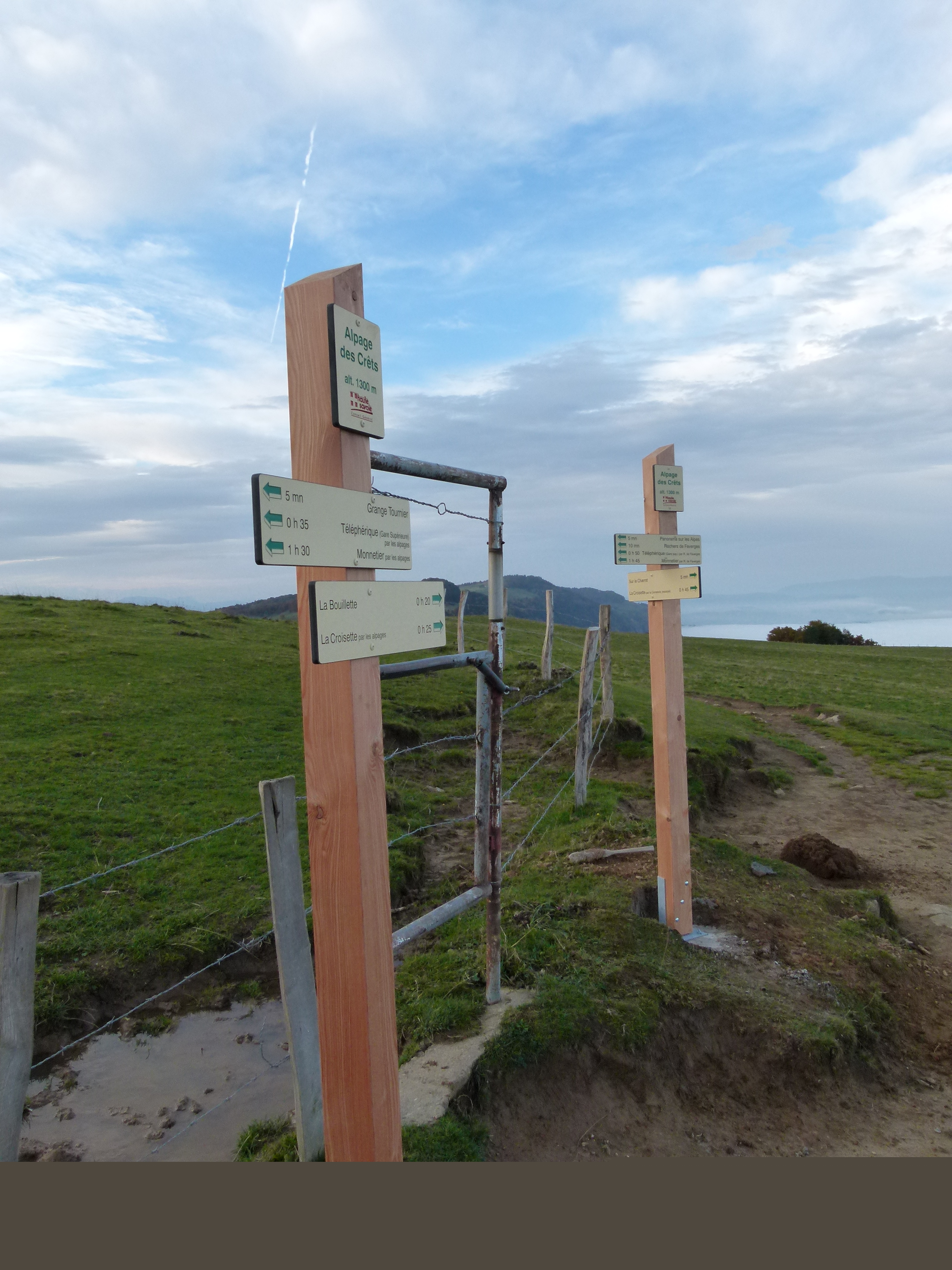 Anschliessend weiter mehr oder weniger längs der Krete bis zum Aussichtspunkt auf 1244 m. Weiter SW bis zum Punkt 1286. Der Weg ist ausgeschildert als GR BL (Grand Randonné Balcon du Léman). Offenbar ist seit Drucklegung meiner Karte einiges geändert worden und die Markierung ist nicht immer sehr einheitlich. Man muss schon etwas aufpassen, dass man die Markierung immer findet. Die Wege sind auf der Karte auch nicht immer dort wie in Natura (Grins!!). In La Croisette habe ich dann prompt einen falschen Weg erwischt. Wie ich es (endlich) gemerkt habe, war ich zu bequem, wieder zurück zu gehen und fand ich könnte mich einfach in der Falllinie wieder auf die Krete hoch begeben. Ging dann ja auch, aber wie. Ueber Tierwechsel und viel Gestrüpp und Beerenstauden fand ich dann den richtigen Weg schon wieder. Dafür gab es einige Kratzer an meiner Karosserie und ermüdend war es zudem. Also in La Croisette darauf achten, näher zum Skilift aufzusteigen.