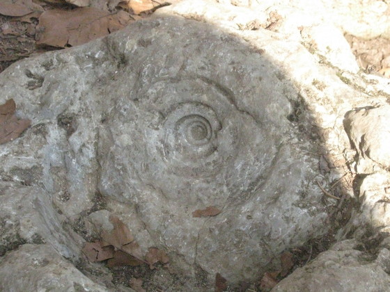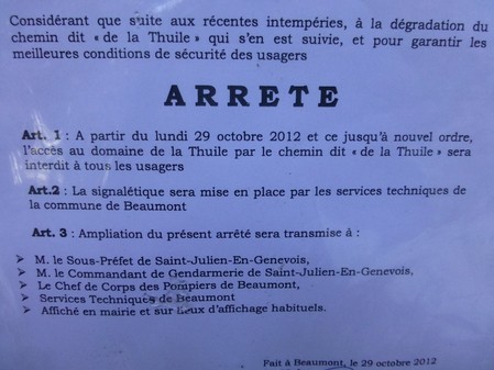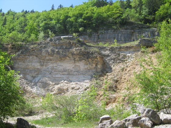 Schliesslich war ich dann trotz den Mühen beim Turm bei "Le Grand Piton". Nun der Abstieg, signalisiert (Beaumont + Archamps). Bis zur Forststrasse einigermassen normal. Nachher recht steil hinunter. Da es in der Nacht vorher offenbar auch hier geregnet hatte, war alles saumässig rutschig. Stellenweise war der Weg in Felsen kaum ersichtlich. Stöcke wären hilfreich gewesen (Zuhause im Keller wurden diese wenigstens nicht schmutzig). Kurz vor Beaumont kommt man aus dem Wald. Per Zufall sah ich den Wegweiser Richtung Archamps. Noch einmal durch Stock und Stein. Wen wundert’s, wenn man die Felsen von unten ansieht, da kommt sicher ab und zu mal was runter.