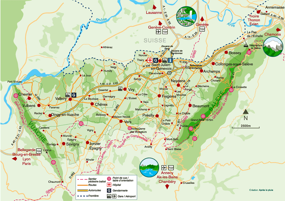 • au Sud-Est, la vallée de l’Arve, la chaîne des montagnes alpines du massif des Aravis et du massif du Mont-Blanc
