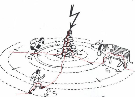 Le principe est "ne pas dépasser" (choisir une cuvette). Eteindre téléphone portable et radio. Eloigner tout objet métallique, perdre rapidement de l’altitude, puis essayer de trouver un lieu offrant la meilleure protection: De préférence non forêt, caché sous une proéminence rocheuse d’au moins 4 mètres de haut (la zone « protégée » est égale à la hauteur du rocher + 2 mètres. Dans ce cas éloignez-vous 2 mètres de la paroi car l’eau qui ruisselle est un bon vecteur d’électricité). Il ne faut pas se cacher dans une grotte que si celle-ci est suffisamment profonde pour que vous puissiez y entrer et vous y tenir accroupi, au fond, en vous éloignant le plus possible des parois et du plafond. Si en forêt: éloignez-vous le plus possible des troncs.