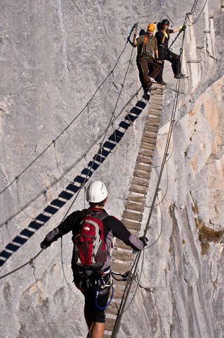 Bras puissants, nerfs solides, condition physique irréprochable sont absolument nécessaire. Longs passages verticaux, peu d'assurage et bonne endurance, surtout dans les bras. Pour les vias ferratas sportives, les chaussures d'escalade ainsi qu'un assurage supplémentaire par une compagnon de cordée peuvent présenter une avantage.