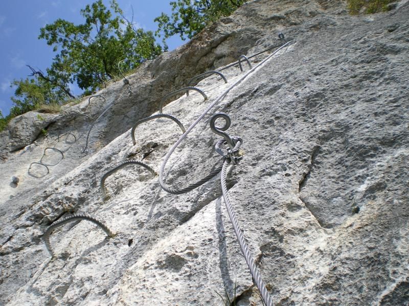 Les passages abrupts ou verticaux sont équipés d'échelles ou de crampons. Sur terrain peu difficile, les câbles métalliques ou mains-courantes assurent le via-ferratiste. Auto-assurage avec prudence.